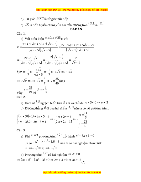 b) T gi ứ ác BIKC là t gi ứ ác n i ộ ti p ế c) IK là ti p t ế uy n chung ế c a hai ủ n a ử đư ng t ờ ròn O O 1 và 2 ĐÁP ÁN Câu 1. a) V i ớ đi u ề ki n ệ x 0 , x 2 5 ta có: