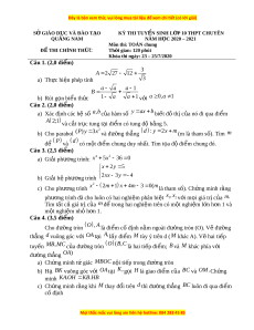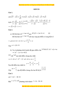 Khóa thi ngày: 23 – 25/7/2020 Câu 1. (2,0 di m ể ) 3 A 2 27 12 a) Th c hi ự n phép t ệ ính 3 a a a 1 B b) Rút g n bi ọ u t ể h c ứ 1 a a 1 v i ớ a 0 , a 1 Câu 2. (2,0 đi m ể ) a) Xác đ nh các ị h s ệ ố a,bc a hàm ủ số y a x b bi t ế đồ th c ị a ủ nó đi qua đi m ể A 2; 1 và c t ắ tr c t ụ ung t i ạ đi m ể có tung đ b ộ ng ằ 5. 2