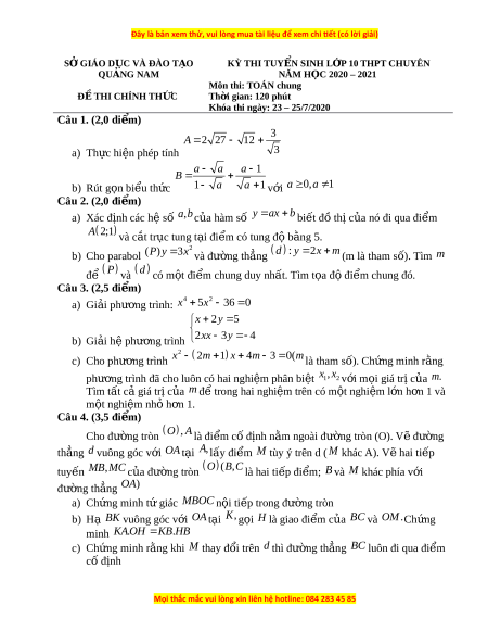 Đề thi vào 10 môn Toán tỉnh Quảng Nam (Hệ không chuyên) năm 2021