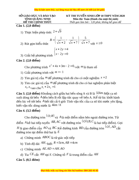 SỞ GIÁO D C Ụ VÀ ĐÀO T O Ạ KỲ THI TUY N Ể SINH L P Ớ 10 THPT NĂM 2020 T N Ỉ H QU N Ả G NINH