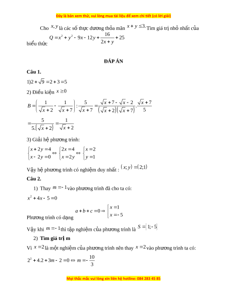 Q x y 9x 12y 25 bi u t ể h c ứ 2x y ĐÁP ÁN Câu 1. 1)2 9 2 3 5 2) Đi u ki ề n ệ x 0 1 1 5 x 7 x 2 x 7 B : . x 2 x 7 x 7