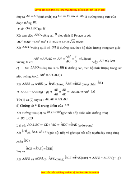 ứ minh AE.AD AH.AO d) Tia CE c t ắ AH t i ạ F. Ch ng ứ t ỏ F là trung đi m ể c a ủ AH Câu 5. (0,5 điêm)