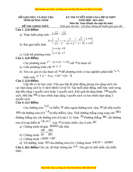 SỞ GIÁO D C Ụ VÀ ĐÀO T O Ạ KỲ THI TUY N Ể SINH VÀO L P Ớ 10 THPT T N Ỉ H QU N Ả G NINH NĂM HỌC 2021-2022