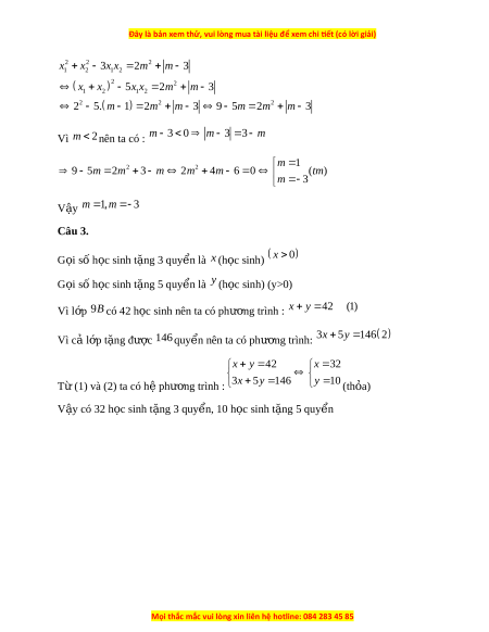 m 3 m 2m 4m 6 0 (t ) m m 3 V y ậ m 1 , m 3 Câu 3. G i ọ số h c s ọ inh t ng 3 quy ặ n l ể à x (h c s ọ inh) x 0 G i ọ số h c s ọ inh t ng 5 quy ặ n l ể à y (h c s ọ inh) (y>0) Vì l p ớ 9B có 42 h c ọ sinh nên ta có phư ng t ơ