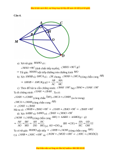 ể ). Qua A kẻ đư ng t ờ h ng s ẳ ong song v i ớ MO, đư ng ờ th ng này c ẳ t ắ đư ng t ờ ròn (O) t i ạ C (C khác ). A Đư ng ờ th ng ẳ MC c t ắ đư ng ờ tròn (O) t i ạ đi m ể B B C . G i ọ H là hình chi u ế c a O ủ trên BC a) Ch ng ứ minh t gi ứ ác MAHO n i ộ ti p ế AB MA b) Ch ng ứ minh AC MC c) Ch ng ứ minh BA H 9 0 d) Vẽ đư ng ờ kính AD c a đ ủ ư ng ờ tròn (O). Ch ng m ứ inh A CH ∽ D MO Câu 5. (0,5 đi m
