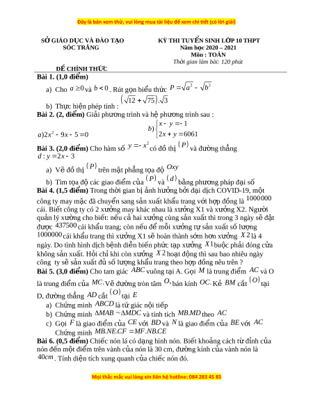 SỞ GIÁO D C Ụ VÀ ĐÀO T O Ạ KỲ THI TUY N Ể SINH L P Ớ 10 THPT SÓC TRĂNG Năm h c ọ 2020 – 2021 Môn : TOÁN Th i