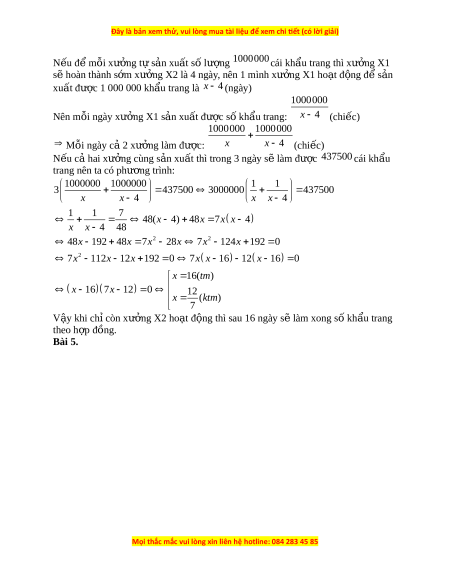 ẩ rang: x 4 (chi c) ế 1000000 1000000 Mỗi ngày c 2 x ả ư ng ở làm đư c: ợ x x 4 (chi c) ế N u ế c hai ả xư ng ở cùng s n ả xu t ấ thì trong 3 ngày s l ẽ àm đư c ợ 437500 cái khẩu trang nên ta có phư ng ơ trình: 1000000 1000000 1 1 3 437500 3000000 437500 x x 4 x x 4 1 1 7