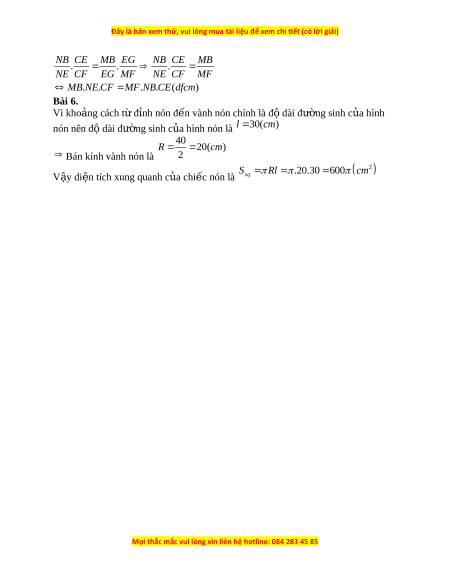 ớ BD và N là giao đi m ể c a ủ BE v i ớ AC Ch ng ứ minh M . B NE.CF M F.N . B CE Bài 6. (0,5 đi m ể ) Chi c ế nón lá có d ng ạ hình nón. Bi t ế kho ng ả cách t đ ừ nh c ỉ a ủ nón đ n m ế t ộ đi m ể trên vành c a
