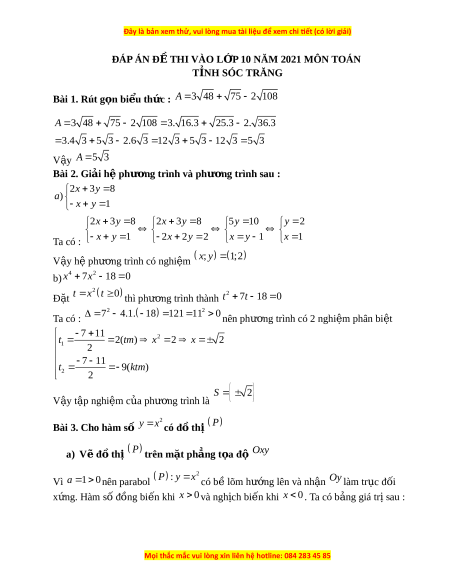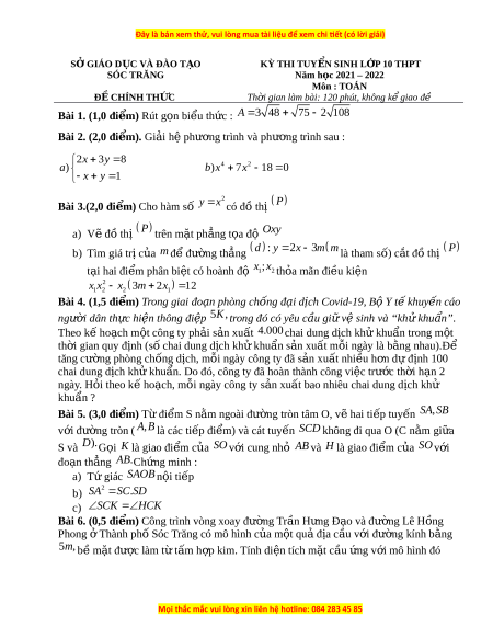 SỞ GIÁO D C Ụ VÀ ĐÀO T O Ạ KỲ THI TUY N Ể SINH L P Ớ 10 THPT SÓC TRĂNG Năm h c ọ 2021 – 2022 Môn : TOÁN Đ C Ề HÍNH TH C Ứ Th i