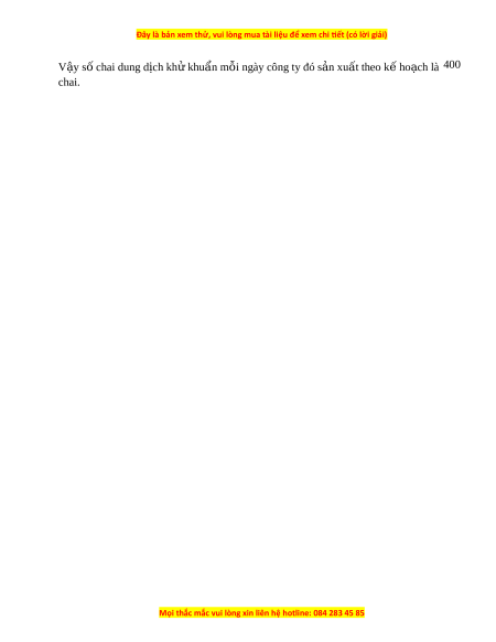 ấ 4.000 chai dung dịch khử khuẩn trong m t ộ th i ờ gian quy đ nh ( ị s chai ố dung d ch kh ị khu ử n s ẩ n xu ả t ấ m i ỗ ngày là b ng ằ nhau).Đ ể tăng cư ng ờ phòng chống d ch, m ị ỗi ngày công ty đã s n ả xu t ấ nhi u h ề n ơ d đ ự nh 100 ị