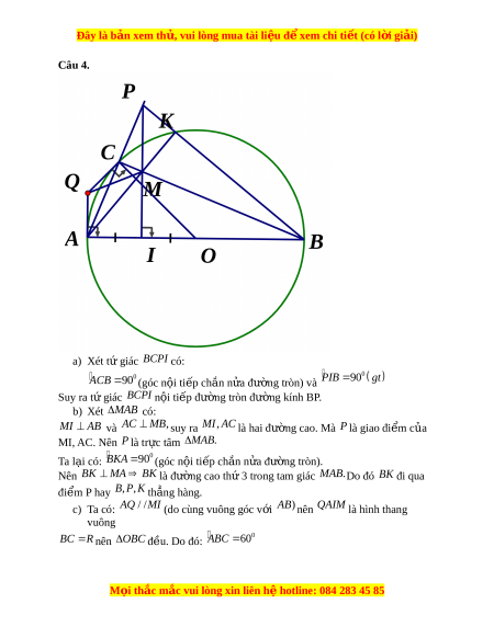 a) Xét tứ giác BCPI có: 0 0 ACB 9 0 (góc n i ộ ti p ch ế n ắ n a đ ử ư ng ờ tròn) và PIB 9 0 gt Suy ra t gi ứ ác BCPI n i ộ ti p đ ế ư ng ờ tròn đư ng ờ kính BP. b) Xét M AB có: