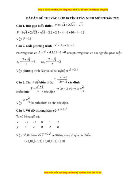 ĐÁP ÁN Đ THI VÀO L P 10 T NH TÂY NINH MÔN TOÁN 2021Ề Ớ Ỉ
