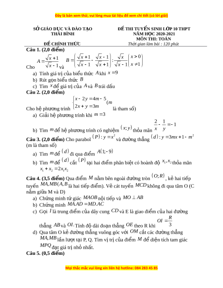 SỞ GIÁO D C Ụ VÀ ĐÀO T O Ạ Đ Ề THI TUY N Ể SINH L P Ớ 10 THPT THÁI BÌNH NĂM H C Ọ 2020-2021 MÔN THI: TOÁN Đ C Ề HÍNH TH C Ứ Th i