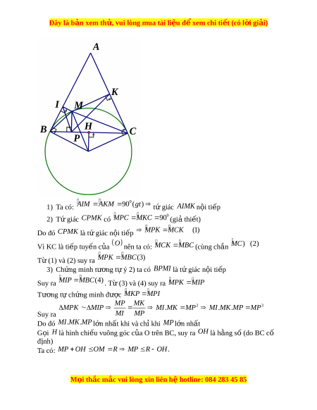 ừ 1) và (2) suy ra MPK M BC(3) 3) Ch ng ứ minh tư ng t ơ ý 2) ự ta có BPMI là t gi ứ ác n i ộ ti p ế Suy ra MIP M BC(4) . T ( ừ 3) và (4) suy ra MPK M IP Tư ng t ơ ch ự ng ứ minh được MKP M PI MP MK 2 3 M PK M IP MI.MK M