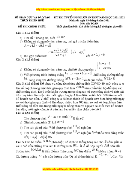 SỞ GIÁO D C Ụ VÀ ĐÀO T O Ạ KỲ THI TUY N Ể SINH L P Ớ 1O THPT NĂM H C Ọ 2021-2022 THỪA THIÊN HUẾ