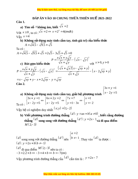 ĐÁP ÁN VÀO 10 CHUNG TH A Ừ THIÊN HU 2021 Ế -2022 Câu 1. a) Tìm s