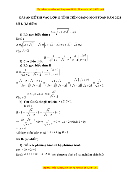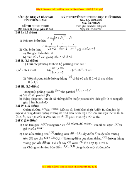 ĐÁP ÁN Đ THI VÀO L P 10 T NH TI N GIANG MÔN TOÁN NĂM 2021Ề Ớ Ỉ Ề