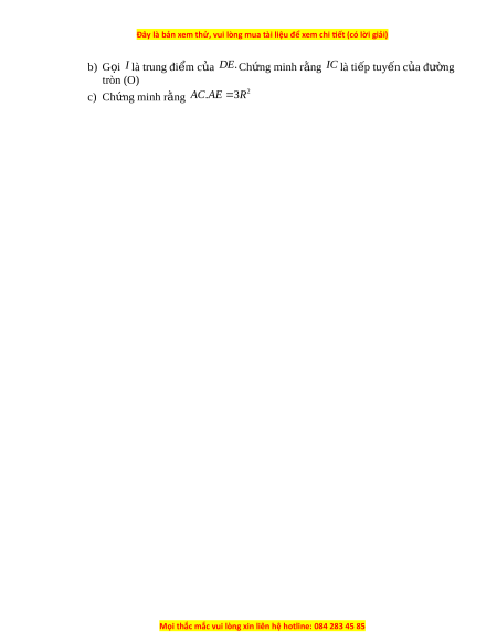 b) G i ọ I là trung đi m ể c a ủ DE. Ch ng m ứ inh r ng ằ IC là ti p t ế uy n c ế a ủ đư ng ờ tròn (O) c) Ch ng ứ minh r ng ằ 2 AC.AE 3 R