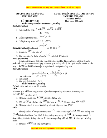 SỞ GIÁO D C Ụ VÀ ĐÀO T O Ạ KỲ THI TUY N Ể SINH VÀO L P Ớ 10 THPT T N Ỉ H TRÀ VINH NĂM H C Ọ 2020 – 2021 Môn thi: TOÁN Đ C Ề HÍNH TH C Ứ Th i ờ gian: 120 phút I. Phần chung cho t t c ấ th ả í sinh (7,0 đi m) ể Bài 1. (3,0 đi m) ể 1. Rút g n bi ọ u t ể h c ứ A 3 27 4 75 2 108 2x y 7 3 x 2y 0 2. Giải h ph ệ ư ng ơ trình 2 3. Giải phư ng