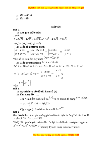 2) IB IF.IA 3) IM I B ĐÁP ÁN Bài 1. 1) Rút g n bi ọ u t ể h c ứ Ta có: A 3 27 4 75 2 108 3.3 3 4.5 3 2.6 3 9 3 20 3 12 3 3 2) Giải h p ệ hư ng t ơ rình: 2x y 7 4x 2 y 14 7x 14 x 2 3x 2y 0 3x 2y 0 y 2x 7 y 3 V y ậ h có nghi ệ m ệ duy nh t ấ ; x y 2; 3 3) Giải phư ng t ơ rình 2