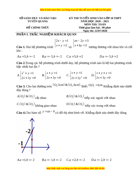 ờ gian làm bài : 90 phút Ngày thi: 22/07/2020 PHẦN I. TRẮC NGHI M Ệ KHÁCH QUAN 2x y 1 ax 2 y 3