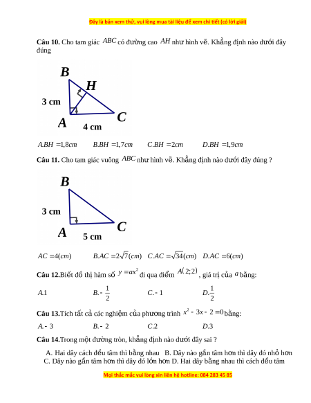 ể A 2;2 , giá trị c a ủ a b ng: ằ 1 1 .1 A . B C. 1 . D 2 2 Câu 13.Tích t t ấ c các ả nghi m ệ c a ủ phư ng t ơ rình 2 x 3x 2 0 b ng: ằ . A 3 . B 2 C.2 . D 3 Câu 14.Trong m t ộ đư ng t ờ ròn, kh ng ẳ đ nh nào d ị ư i ớ đây sai ? A. Hai dây cách đ u t ề âm thì b ng ằ nhau B. Dây nào g n t ầ âm h n t ơ hì dây đó nh h ỏ n ơ C. Dây nào g n t ầ âm h n t ơ hì dây đó l n h ớ n ơ D. Hai dây b ng nhau ằ thì cách đ u t ề âm