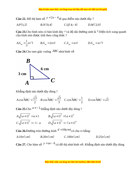 C.AC 34(cm) . D AC 6( cm) 2 Câu 12.Bi t ế đồ th hàm ị s ố y a x đi qua đi m
