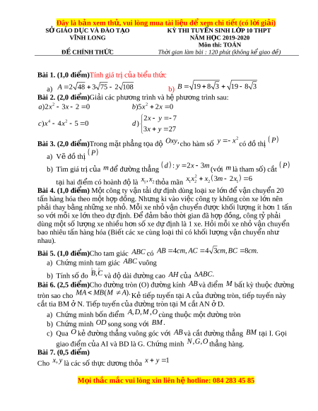 ệ xem ể chi ti t ế (có l i ờ gi i ả ) SỞ GIÁO D C Ụ VÀ ĐÀO T O Ạ KỲ THI TUY N Ể SINH L P Ớ 10 THPT VĨNH LONG NĂM H C Ọ 2019-2020 Môn thi: TOÁN Đ C Ề HÍNH TH C Ứ Th i