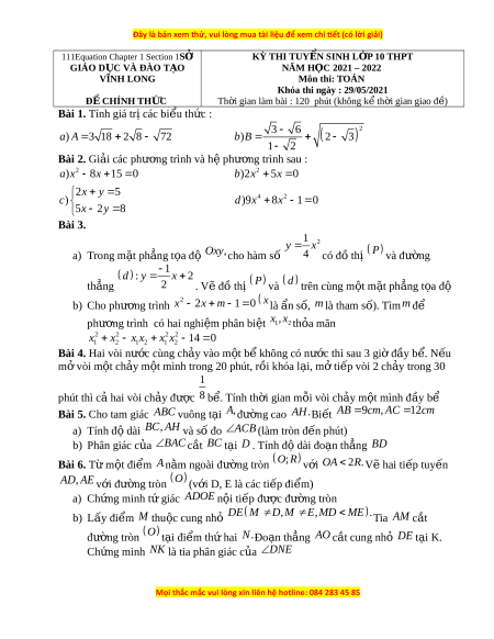 NĂM HỌC 2021 – 2022 VĨNH LONG Môn thi: TOÁN
