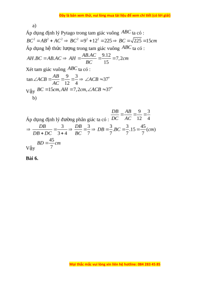 Bài 5. Cho tam giác ABC vuông t i ạ , A đư ng cao ờ AH.Bi t ế AB 9 c , m AC 1 2cm a) Tính đ dài ộ