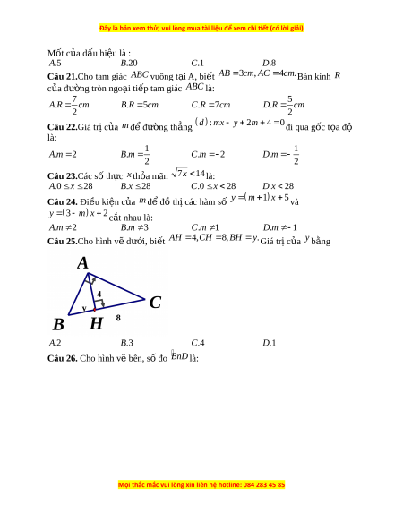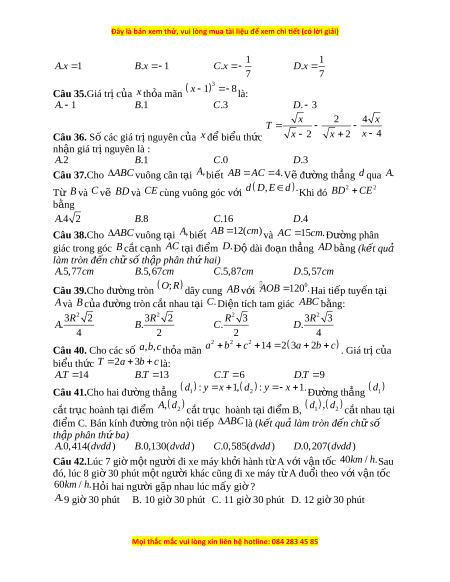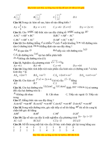 x b a 0 đi qua hai đi m ể A 2; 1 và B1;7 là : . A a 1 . B a 2 C.a 2 . D a 1 0 Câu 32.Cho A HB vuông t i ạ H , B 60 , BH 10 . cm Độ dài c a c ủ nh ạ AH là : . A AH 1 0 3cm . B AH 2 0cm C.AH 1 5 3cm . D AH 2 0 3cm Câu 33.K t ế quả rút g n ọ bi u t ể h c ứ Q 5 3 29 12 5 là: . A Q 4 . B Q 2 C.Q 1 . D Q 3 2 Câu 34.Nghi m ệ c a ủ phư ng t ơ rình 2x 2 3 x 1là: