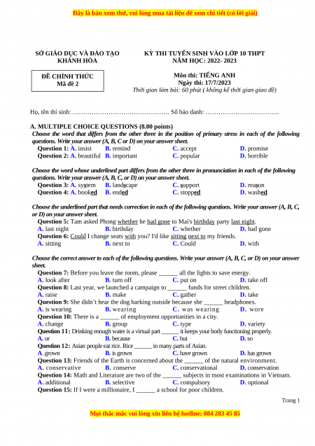 KỲ THI TUYỂN SINH VÀO LỚP 10 THPT KHÁNH HÒA NĂM HỌC: 2022- 2023 ĐỀ CHÍNH THỨC Môn thi: TIẾNG ANH Mã đề 2 Ngày thi: 17/7/2023