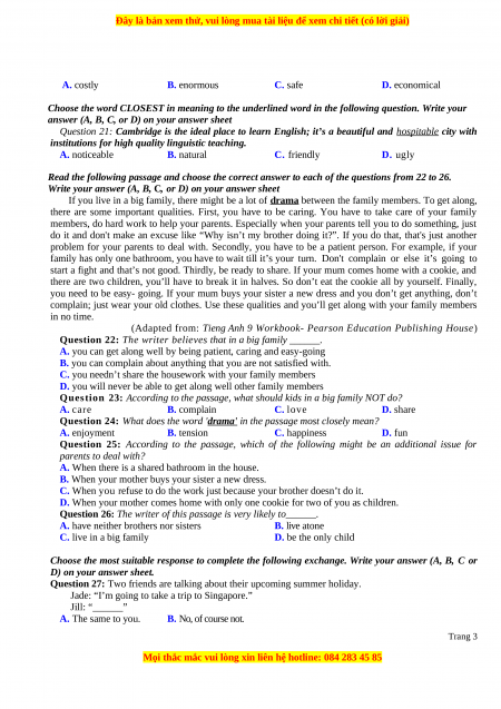 Jade: “I’m going to take a trip to Singapore.” Jill: “______” A. The same to you. B. No, of course not. Trang 3