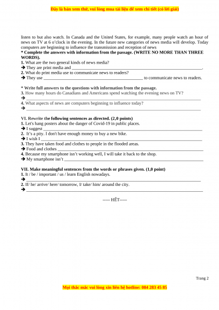 VI. Rewrite the following sentences as directed. (2,0 points)