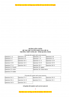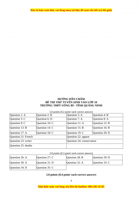 3.0 points (0.3 point/ each correct answer) Question 26: A Question 27: C Question 28: B Question 29: D Question 30: A Question 31: D Question 32: A Question 33: C Question 34: D Question 35: C