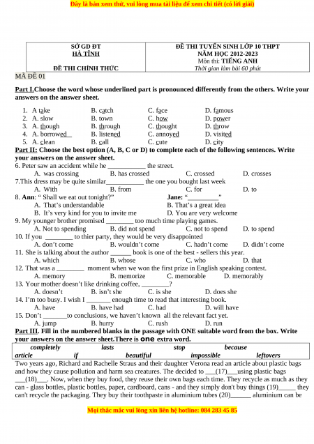 ĐỀ THI TUYỂN SINH LỚP 10 THPT HÀ TĨNH NĂM HỌC 2012-2023 Môn thi: TIẾNG ANH ĐỀ THI CHÍNH THỨC