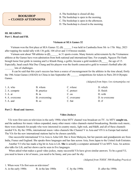D. The bookshop is closed in the morning. III. READING Part 1. Read and Fill. Vietnam at SEA Games 32