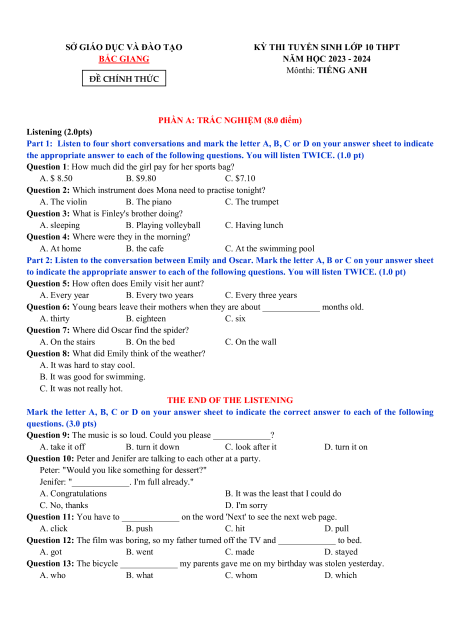 KỲ THI TUYỂN SINH LỚP 10 THPT BẮC GIANG NĂM HỌC 2023 - 2024 Mônthi: TIẾNG ANH ĐỀ CHÍNH THỨC
