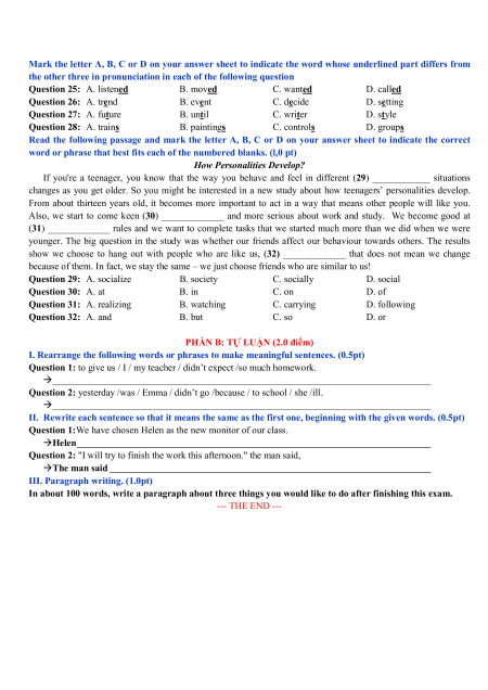 the other three in pronunciation in each of the following question Question 25: A. listened B. moved C. wanted D. called Question 26: A. trend B. event C. decide D. setting Question 27: A. future B. until C. writer D. style Question 28: A. trains B. paintings C. controls D. groups