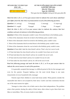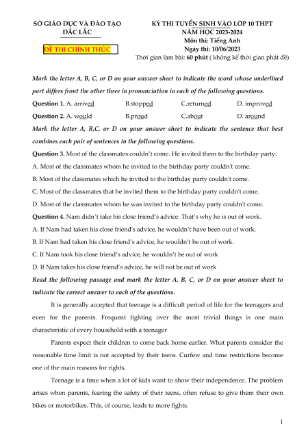 KỲ THI TUYỂN SINH VÀO LỚP 10 THPT ĐẮC LẮC NĂM HỌC 2023-2024 Môn thi: Tiếng Anh ĐỀ THI CHÍNH THỨC Ngày thi: 10/06/2023