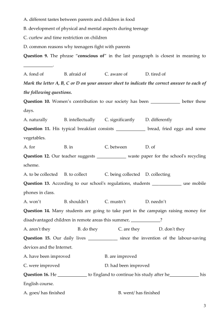 Question 10. Women’s contribution to our society has been _____________ better these days. A. naturally B. intellectually C. significantly D. differently