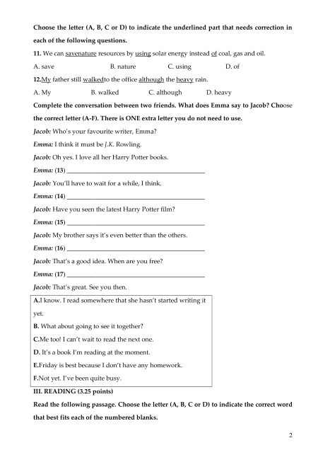 F.Not yet. I’ve been quite busy. III. READING (3.25 points)