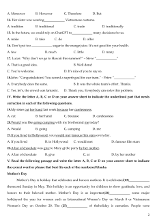 stepmothers, and fostermother are (27) _____________ in the holiday. 23. A. on B. in C. at D. to 24. A. than B. so C. as D. less 25. A. image B. picture C. icon D. sign 26. A. and B. if C. whether D. but 27. forced B. rewarded C. received D. honored