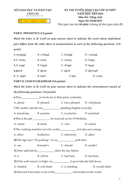 KỲ THI TUYỂN SINH VÀO LỚP 10 THPT LÀO CAI NĂM HỌC 2023-2024 Môn thi: Tiếng Anh ĐỀ THI CHÍNH THỨC Ngày thi: 03/06/2023