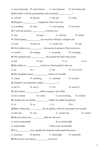 26.My new shoes are_____________ than the old ones. A. more comfortable B. as comfortable C. comfortable D the most comfortable