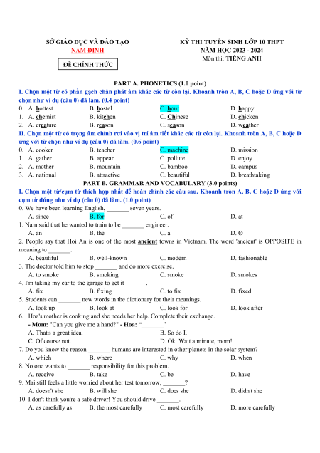 KỲ THI TUYỂN SINH LỚP 10 THPT NAM ĐỊNH NĂM HỌC 2023 - 2024 Môn thi: TIẾNG ANH ĐỀ CHÍNH THỨC PART A. PHONETICS (1.0 point)