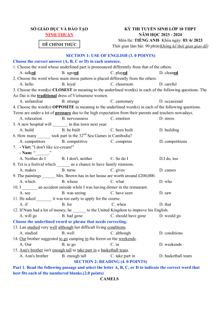 KỲ THI TUYỂN SINH LỚP 10 THPT NINH THUẬN NĂM HỌC 2023 - 2024