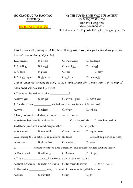 KỲ THI TUYỂN SINH VÀO LỚP 10 THPT PHÚ THỌ NĂM HỌC 2023-2024 Môn thi: Tiếng Anh ĐỀ THI CHÍNH THỨC Ngày thi: 05/06/2023