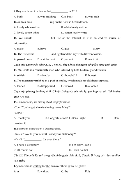 Câu III. Tìm một lỗi sai trong bốn phần gạch chân A, B, C hoặc D trong các câu sau đây. (0,8 điểm)