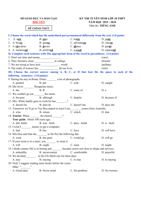 KỲ THI TUYỂN SINH LỚP 10 THPT PHÚ YÊN NĂM HỌC 2023 - 2024 Môn thi: TIẾNG ANH ĐỀ CHÍNH THỨC